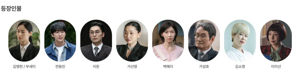 | 김영란 / 부세미 | 전여빈 | 가난한 경호원 출신으로, 재벌가의 계약 결혼 제안을 받아 ‘부세미’로 위장해 살아가는 인물. 겉으로는 강하지만 내면에는 깊은 불안과 상처가 있음. |