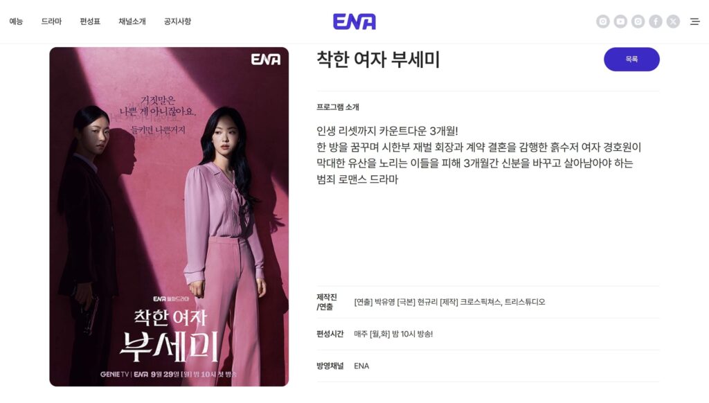 ‘착한 여자 부세미’는 2025년 9월 29일부터 ENA에서 방영 중인 월화드라마로, 범죄와 로맨스가 결합된 미스터리 서사입니다.