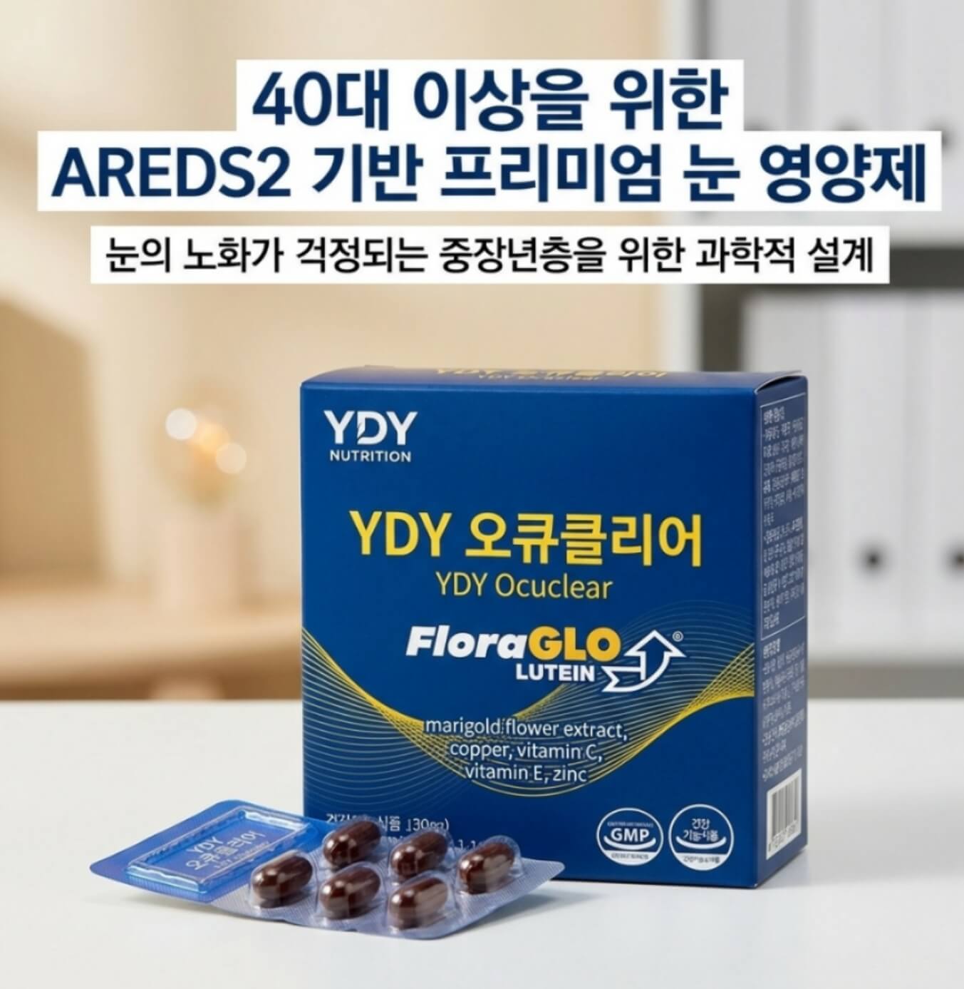 40대 후반부터 시작되는 눈의 침침함과 흐릿함, 단순한 피로가 아닌 노화의 신호일 수 있습니다. 황반변성과 백내장 같은 퇴행성 눈 질환의 위험이 급격히 증가하는 시기입니다. YDY 오큐클리어는 미국 국립보건원(NIH)의 AREDS2 연구를 기반으로 설계된, 중장년층 전용 프리미엄 눈 영양제입니다.